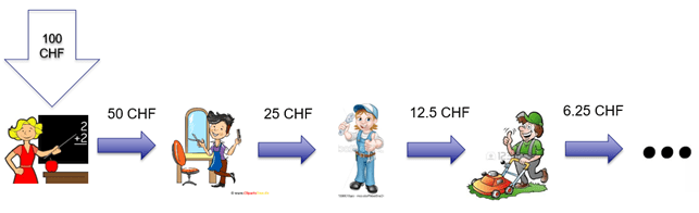 Lo Stato decide di assumere una maestra e la paga 100. La maestra grazie a questo stipendio va dal parrucchiere e spende 50. Il parrucchiere decide di chiamare l’idraulica e la paga 25. L’idraulica telefona al giardiniere che le fattura 12.50. Il giardiniere spende 6.25…. e così di seguito.